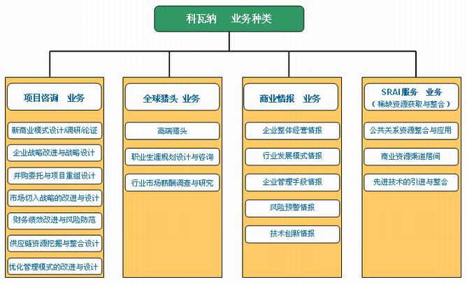 公司的优势在于对不同行业有着深度理解和研究,通过把研究与实践所得的成果,广泛的应用于各个商业领域,致力帮助客户改进新的商业模式、提升运营手段、提高持续赢利能力。专业的咨询方法和有效的解决方案,触使科瓦纳在业内具有较高的知名度,无论在项目咨询、高端猎头、渠道居间等多个领域拥有诸多的成功案例。确保客户的持续赢利能力一直是科瓦纳追力的最终目标