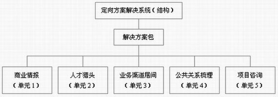 1)定向方案解决:由一个方案包5个单元内容组成。每个单元可依据客户自身需求进行选择组合或整体打包解决(细下例图示),该业务种类主要采用一站式手段帮助客户解决前后问题,主要适用范畴:企业的新市场拓展、公司并购重组、定向业务链发展等。